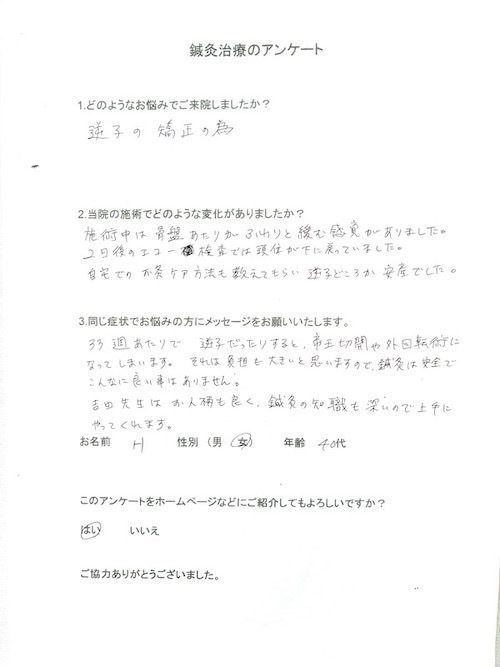 自宅でのお灸のケアも教えてもらい逆子どころか安産でした。